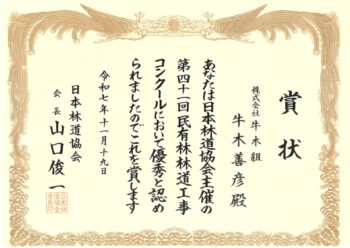 日本林道協会主催の「第41回 民有林林道工事コンクール」において、優秀賞をいただきました2025/11/20