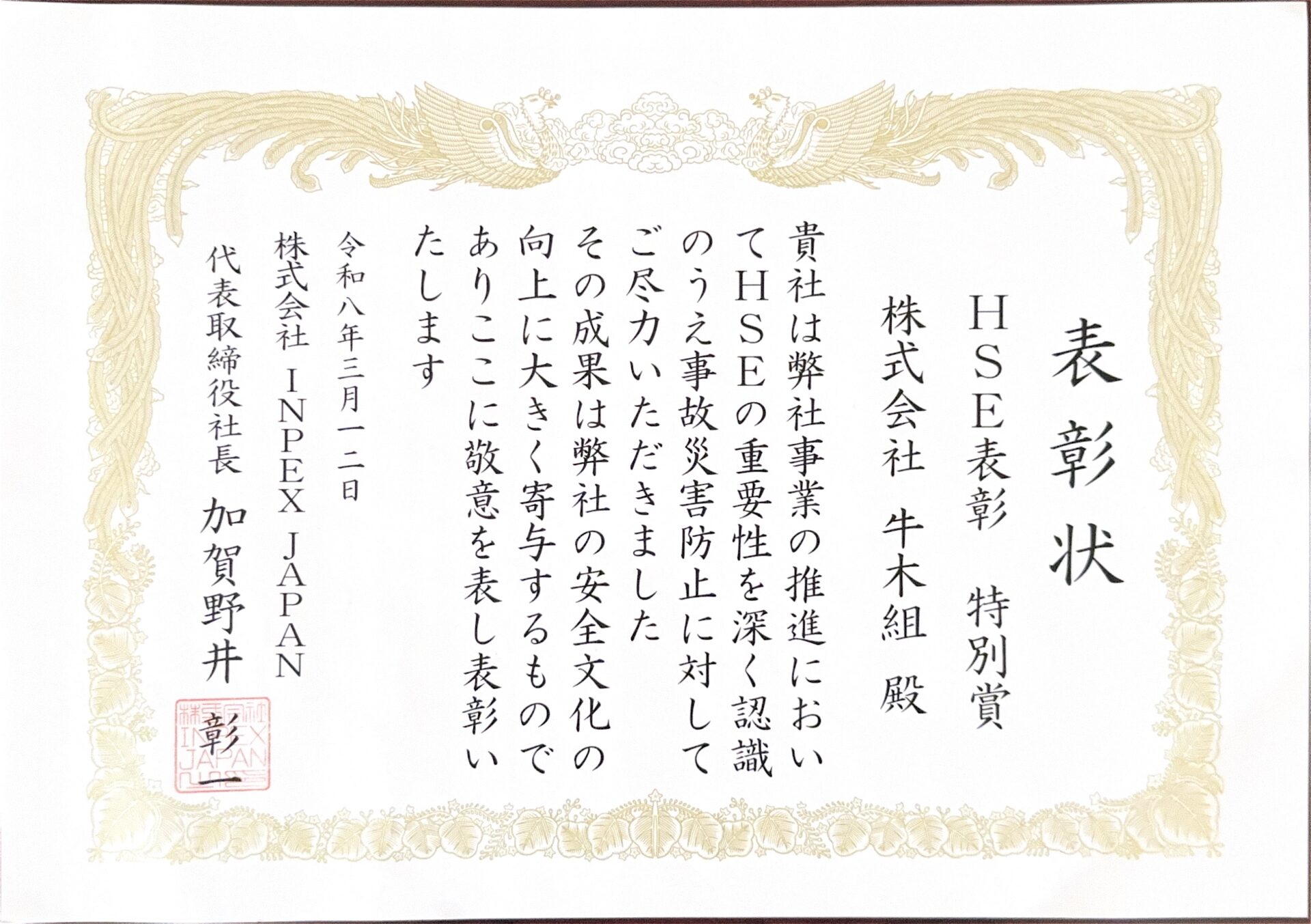 株式会社INPEX JAPAN様よりHSE特別賞を受賞しました